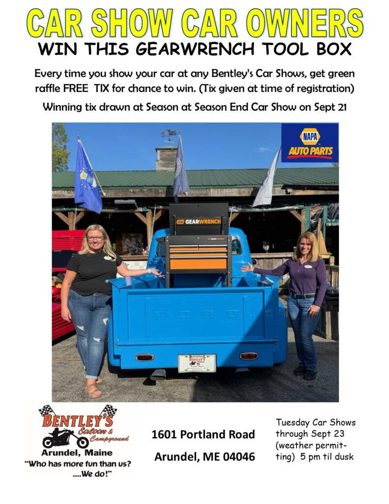 Bentley's Season Open Car Show on Sunday, May 11, 2025 had 284 special interest vehicles on display! Bentley's Cruisin' Night Tuesday Car Shows began May 20, 2025, through September 23, 2025, weather permitting, from 5 pm til dusk (no Tues show on June 17 during Biker Rally). All special interest cars are welcome, and it's one of our favorite nights of the week to get together to enjoy the show and camaraderie. Often times there are more than 100 cars on display! There are no entry fees for car show owners or spectators. Car show owners receive door prizes, spectator choice awards and a chance to win a FREE toolbox valued over $1,000 thanks to Gear Wrench and our local Biddeford Sanel NAPA Auto Parts Store. We offer cash raffles for everyone to participate and donate a portion of the money to our Town of Arundel's Holiday Program for local residents in need of a helping hand during the holiday season. In 2024, we were able to donate nearly $3,000 thanks to our car show and museum guests!