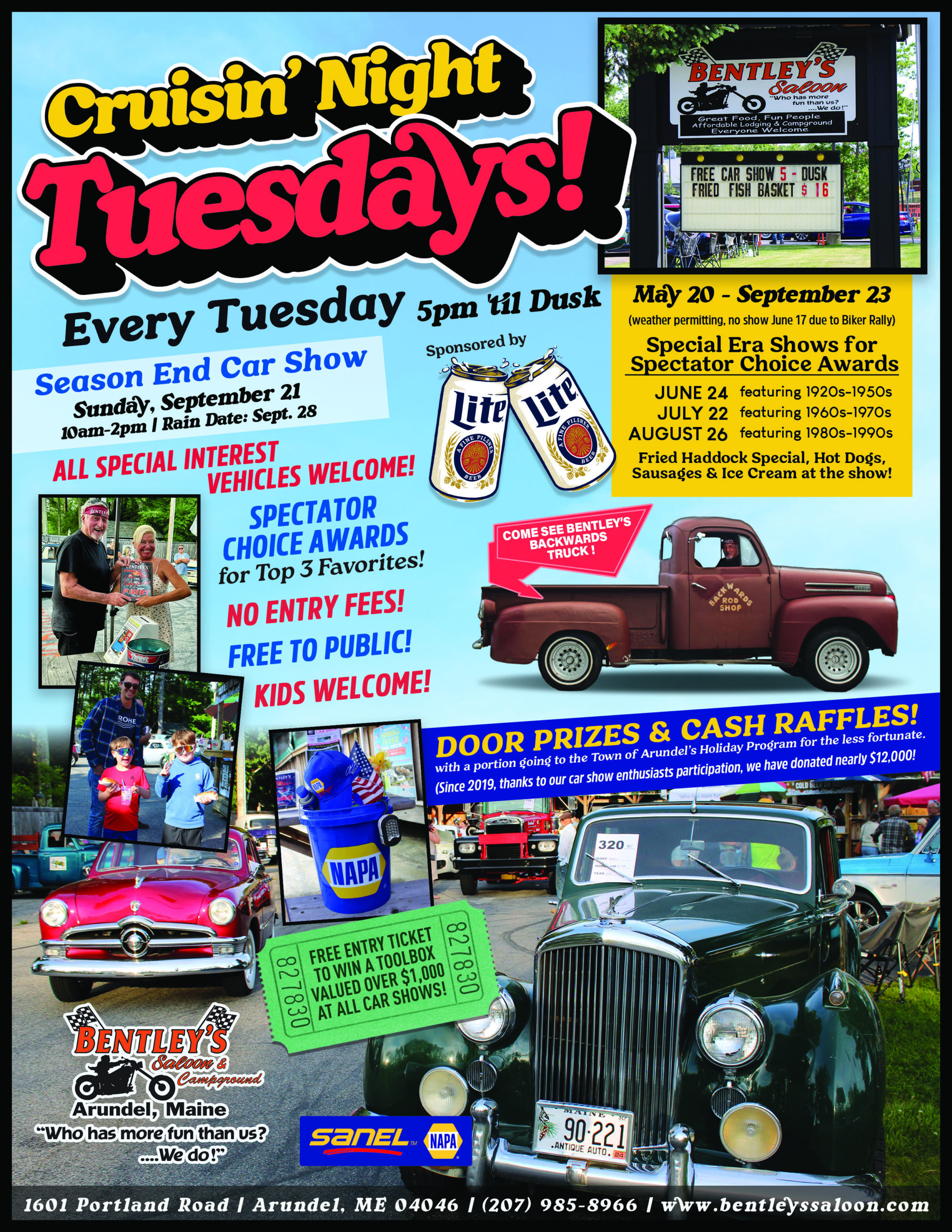Bentley’s Season Open Car Show is on Sunday, May 11 (rain date May 18) from 10 am til 2 pm.  Then weekly Bentley’s Cruisin’ Night Tuesday Car Shows from 5 pm til dusk (May 20 through Sept 23, 2025, based on weather, no Tues show on June 17 during Biker Rally).  All special interest cars are welcome and it’s one of our favorite nights of the week to get together to enjoy the show and camaraderie. Often times there are more than 100 cars on display! There are no entry fees for car show owners or spectators. Car show owners receive door prizes, spectator choice awards and a chance to win a FREE toolbox valued over $1,000 thanks to Gear Wrench and our local Biddeford Sanel NAPA Auto Parts Store.  We offer cash raffles for everyone to participate and donate a portion of the money to our Town of Arundel’s Holiday Program for local residents in need of a helping hand during the holiday season. Since 2019, we were able to donate close to $12,000 thanks to our car show and museum guests!