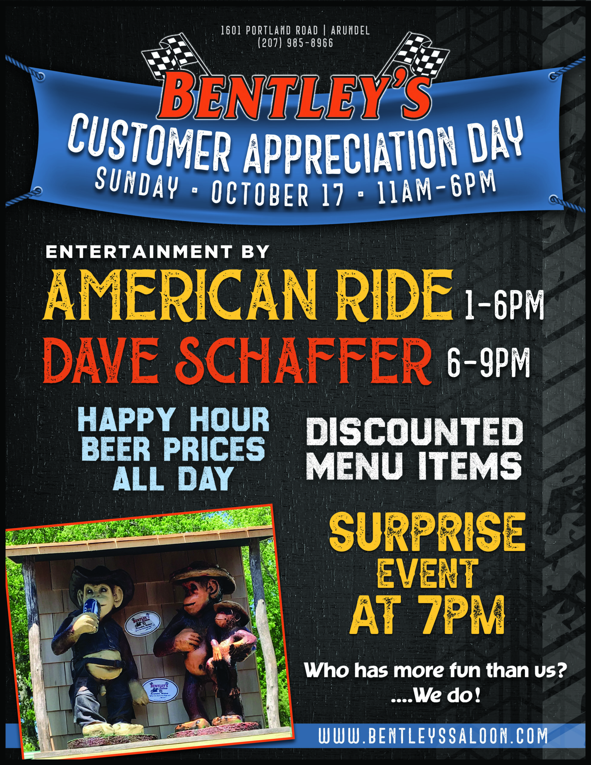 Customer Appreciation Day happy hour beer prices all day and discounted meals. American Ride Maine performs from 1 til 6 pm and Dave Schaffer from 6 til 9 pm. Surprise event at 7 pm!